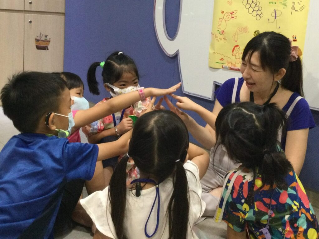 第一階段的團體暖身遊戲「釘子釘個」,請孩子將食指放在老師掌心下,歌聲結束後快速地將手抽離,來不及抽回手指的孩子就會被老師抓住!一開始孩子來不及反應,慢慢地進入狀況後就能快速反應,最後孩子玩得起勁,知道被抓到後就能當關主,所以會刻意放慢抽回手指的速度讓老師可以抓到他呢!接續兩人一組相互關注與快速切換應變的「眼睛、眼睛、耳朵!」,猜拳贏的一方先開始喊:「眼睛、眼睛、耳朵!」,喊完將雙手移位至另一感官部位,對方轉移的感官部位如果和前者一樣就輸了。