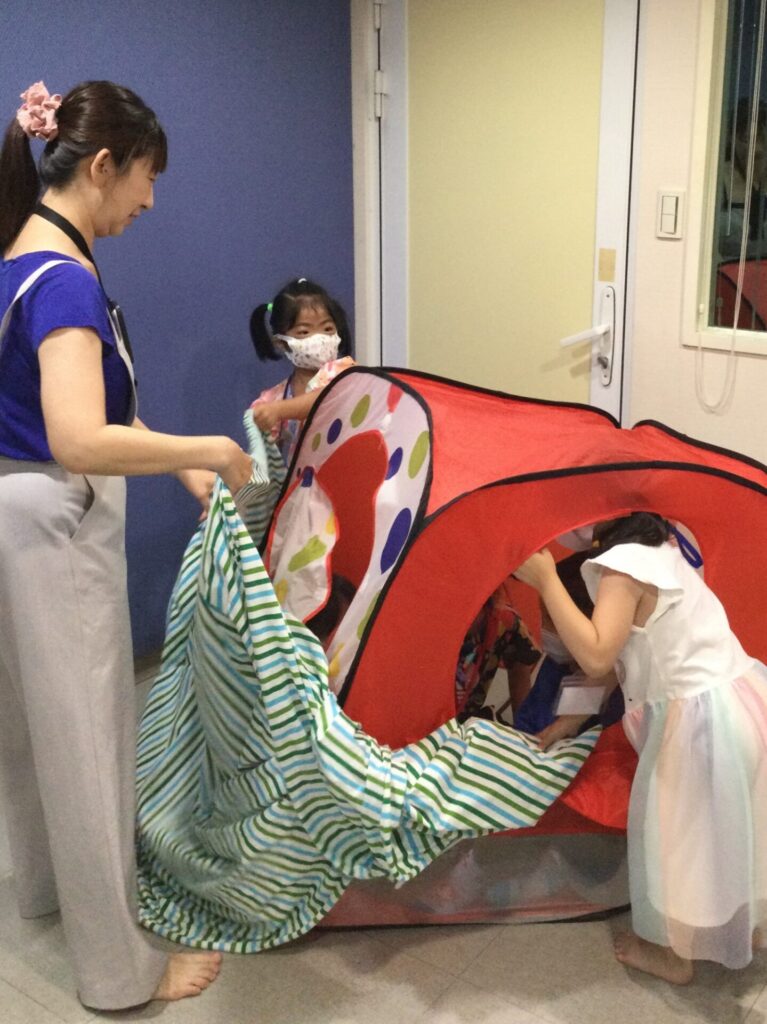老師相信孩子都很快就學會,沒想到最後的關鍵都沒有真正的理解而反應不過來,變成模仿的遊戲,老師遂轉為團體多對一的進行,以澄清、熟悉遊戲的規則。緊接著是團體自主決定的遊戲「蓋房子」,團體以帳篷為主體,再加以裝飾與延伸扮家家酒的互動,觀察小朋友們的自主互動內容,一開始都非常興奮地跑進房子內,感受躲回媽媽肚子般被保護的感受與遭受暴風雨等等外在迫害的危險不安、搖搖欲墜。只有一位至兩位小朋友不知如何擠進去,或在外流連、獨自遊戲,團體動力分明立見。