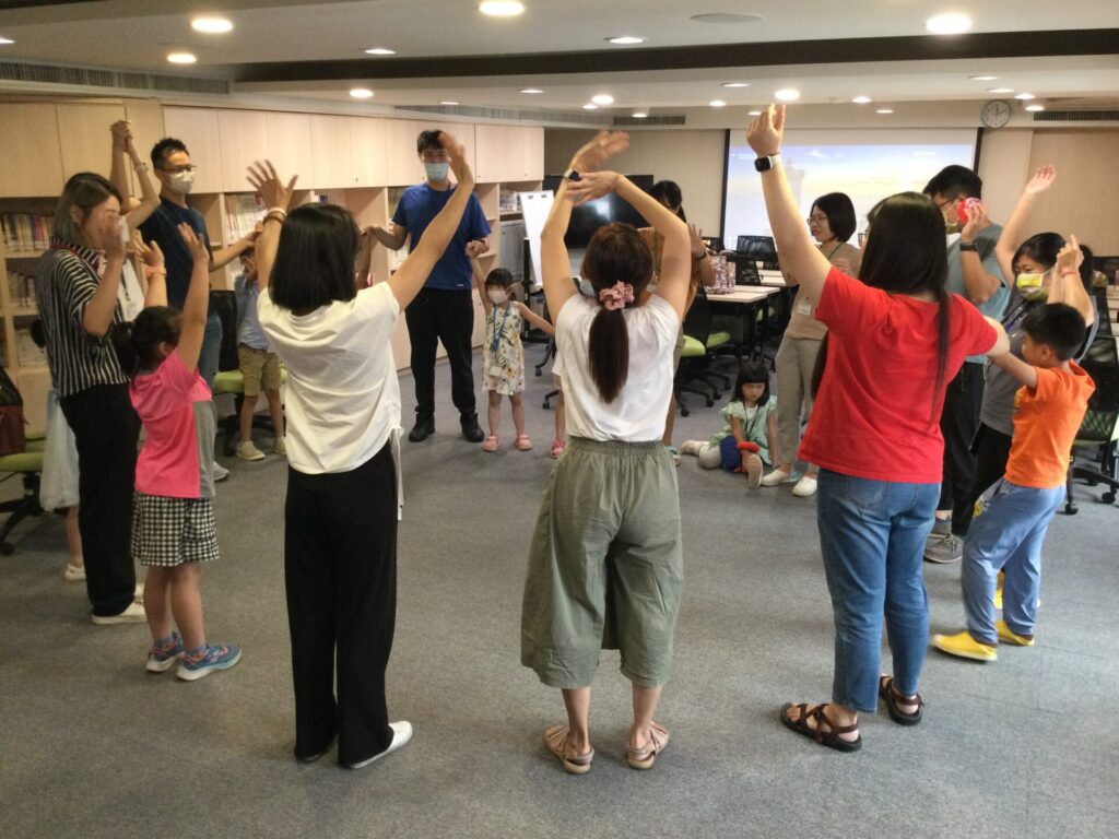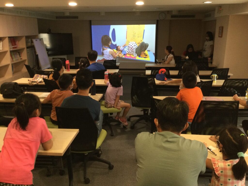 緊接著是家長與小朋友們一同觀賞前一堂課小朋友們合作排演的「小紅帽劇場」,小朋友們看見自己出現在影片中時出現不同的反應,有的開心、有的向家長描述故事內容等等,家長們也透過精彩的戲劇演出看見自己寶貝的成長與進展。