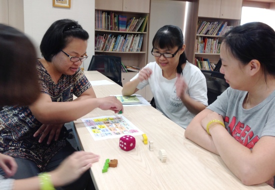 課程後半段,老師以桌遊與家長回顧前四堂課程的教學目標(聽能、說話、認知、語言),大部分家長已能將目標融入生活情境中,例如:家長知道孩子已經學會的詞彙,接著可以運用繪本擴展語言,或是與孩子互動時先強調聽能優先技巧等,透過父母成長團體共五次的課程,期望家長在家中帶孩子時,可以更清楚引導孩子的技巧。