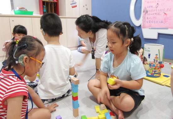 緊接著進入遊戲時間,孩子們首先進行兩人小組遊戲,孩子們合作搭建積木,彼此自由練習溝通協調。老師發現孩子們在分組時,就出現許多互動小狀況,最常見的是孩子堅持與特定對象同組,當下老師協助孩子看到不同選擇的可能性,孩子才漸進地放下執著與焦慮。遊戲開始前也考驗著許多孩子的耐性,衝動的孩子不斷地搶著跑出來,看到積木就不管同伴與規則,在老師清楚堅定的要求下,大家終於能了解並共同遵守遊戲的規則。遊戲中可以觀察到同伴間的溝通方式,譬如有孩子太過擔心積木被破壞,所以都不讓伙伴幫忙,變成各拼各的;有的則缺乏自信而表示不要幫忙;也有一組看似合作融洽,最後才分享覺得困難,但不知如何跟伙伴或老師求助。雖然共同達成目標的過程挑戰重重,但孩子們勇於面對困難、投入活動、學習改變方法,並大方分享,仍然值得肯定!