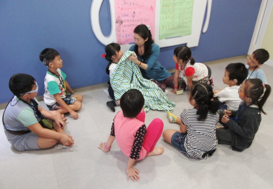 第一個活動孩子們就興奮的投入,老師設計了要伸手觸摸的布箱,裡面裝了許多小物件,作為猜謎的題目,請小朋友輪流摸出一個物件,藏在布底下,然後出題引導其他小朋友猜出答案。過程中,小朋友們雙向的問答極為熱烈,渴望答對、看見謎底的動機也很高,以致孩子們頻頻趨身向前,爭先恐後地發問,就算害羞少話的孩子上台也絕不冷場。許多小朋友因急於發問、答對,而無法專心傾聽別人的問題與訊息,甚至會重覆地猜答、說出無關的答案,讓討論更加模糊。這時老師示範統整已知的重要線索、排除不相干的方向,以鼓勵大家繼續探索接近答案,慢慢地熟習解題思維、步驟與詢問技巧。除此之外,出題者當然也扮演著重要的角色,老師觀察到平常構音不清的孩子,出題時卻能自然地放慢速度、強調發音與口形,或運用簡單語句、圖畫作提示,自行達成溝通的交流;而本來無法理解猜謎遊戲的孩子,後來也學習守住謎底,並配合動作神情等方式來表演出題,孩子們的表現真是出乎意料之外的棒呢!