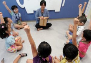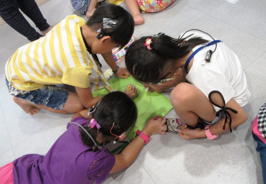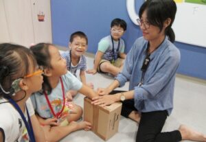 最後來到大家等待已久的遊戲時間「摸摸樂」啦!老師在摸彩箱中藏著不同物品,孩子們只能靠觸覺感受物品的形狀、質感等,在摸的過程中要向他人說出自己的感受,最後每組要動腦討論出箱子裡所藏的物品。孩子們都十分投入活動,踴躍爭取擔任摸物品的角色,在老師引導下孩子們輪番分享自己覺得箱子裡的東西是什麼,有一次正確解答是放大鏡,但孩子們摸完後,有人回答是鏡子,也有人說是棒棒糖,每組在討論答案時,有孩子堅持自己的答案才是正確解答,而不願意傾聽其他隊員的看法,老師於是從中協調讓孩子們學習當別人看法和自己不同時,可以怎麼表達自己的想法。遊戲進行到最後,孩子們不僅互相提醒要仔細摸,還會鼓勵比較膽小的孩子