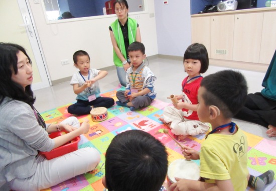 接著是音樂表演小組合作活動,首先老師鼓勵孩子們用身體動作及樂器來創造個人的自我介紹方式,老師發現許多孩子在仿說句子時十分緊張、感到困難,更難同時搭配動作和樂器。後續課程中,孩子們亦只專注在樂器上面,而較不和他人一起合作表演,由此可以看出許多孩子的發展階段仍在單純的人-物聯結,開口表達也比較少。後來老師跟隨孩子,教導孩子舉手等待後才發言,也讓孩子有機會提出交換樂器的要求。令人開心的是,孩子們對於分享與交換的請求都大方答應,也願意與他人輪流玩、學習控制自己的衝動與著急。但進行兩人一組的小組活動時,孩子們仍缺乏合作概念,譬如要選擇同一首歌、一起表演這首歌等,都需要很多的提醒與引導,對於明確表達自己的意見還需要多練習。