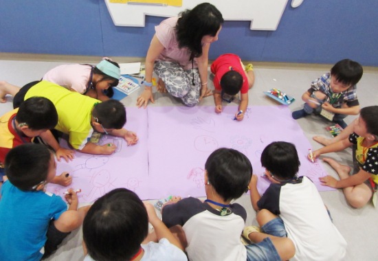 暖身活動後,老師就正式介紹”團體規範”,以凝聚出大家相處的默契。老師先畫圖介紹基本原則,如準時上課、舉手發言或詢問、如何在互動時求助、生氣情緒該如何反應等,小朋友們也紛紛表達意見、給予回應。接下來的塗鴉活動,看見孩子熱情分享自己有興趣的事物、表達豐富的情感。創作過程中,雖有孩子默默地移到無人的空間,但多數孩子仍傾向待在原來的位置,就算較擁擠也要和小朋友靠在一起。