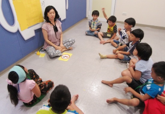 此次參加的小朋友較多,較過去更熱鬧了!在孩子找到自己的位置後,老師運用獎勵計分表提醒孩子注意自己的行為,包括雙腳交叉端坐、眼睛看老師、保持安靜等,幾乎所有的小朋友們都能很快地配合做到;老師也讓少數對陌生情境較焦慮或與家長分離困難的孩子,先由家長陪伴,讓孩子漸漸放鬆、減輕焦慮感。