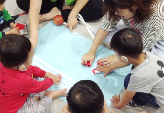 聽損兒團體課程內容則是要讓幼幼班與小班年紀的小朋友們提前體驗入幼兒園的狀況,透過類似遊戲的活動來增加團體互動經驗,提升孩子生活自理的能力。