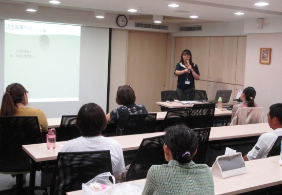 課程一開始,老師先以情境小故事帶領家長體會語言擴展的重要性,之後再教學不同詞性辭彙延伸的步驟,像是孩子已經學會「ㄅㄨㄅㄨ」,再來就可以教學「車子」、「汽車」,此外也能延伸到不同的交通工具像是「救護車」、「垃圾車」、「腳踏車」等。老師也邀請家長一起想可以延伸的辭彙,家長們一開始對於如何延伸辭彙仍不清楚,在老師更多的引導和討論下,在團體分組討論時,各個家長都積極地分享甚至構思出更多可以延伸的方向,像是孩子已經學會多種不同動物後,也可以細分教學「斑點」、「條紋」等動物特徵。