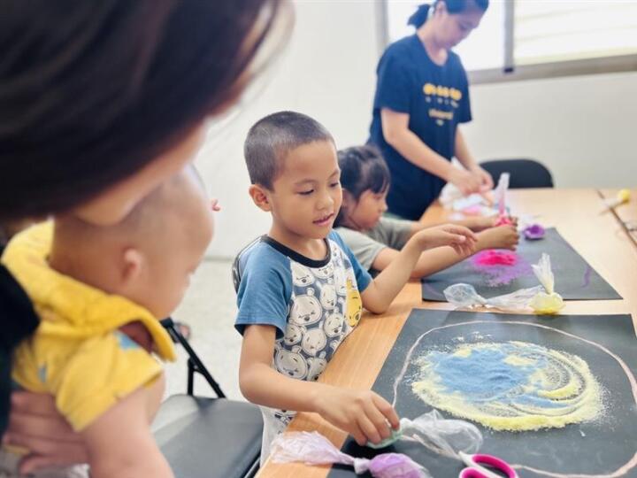 接下來,講師安排了觸覺球互動、沙畫曼陀羅創作,以及彩沙瓶製作等豐富內容。在觸覺球遊戲中,講師說明此活動有助於促進孩子的感官統合能力,也能在愉快的遊戲中增進親子間的交流;沙畫曼陀羅則邀請親子共同體驗視覺與觸覺的療癒效果,享受靜態創作的平靜與美好;最後,親子一同製作彩沙瓶,為活動畫下溫馨句點,留下一份獨一無二的親子回憶。