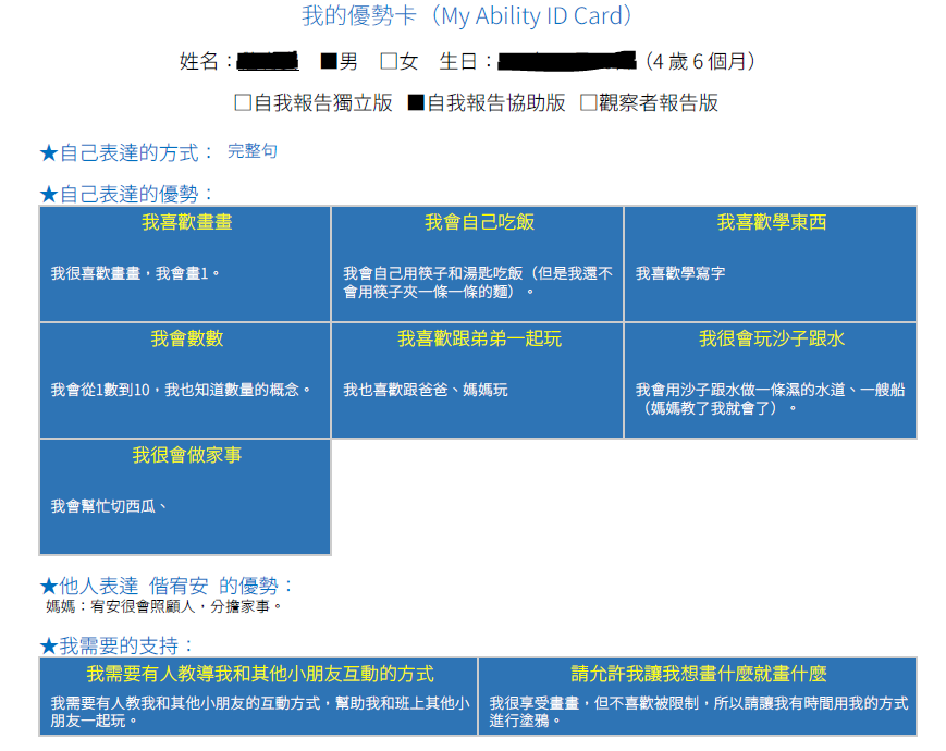 在講師的詢問下,4歲的安安針對自己的優勢能力表示:我很會做家事、我會數數。在需要被支持的部分,安安說不太出來,於是改由講師和媽媽討論:首先媽媽發現安安在校很想與小朋友互動,但卻找不到合適的方法,因此多是自己一人玩。此外,安安雖然很愛畫畫,但在家裡大人期待他畫出一些指定的圖案時,安安卻很抗拒。講師彙整以上資訊,在優勢卡上呈現:「我需要有人教導我和其他小朋友一起玩的方式」、「請允許我每天都有自己想畫什麼就畫什麼的自由時間」,便是孩子主觀意志和支持需求的展現。