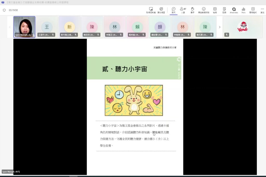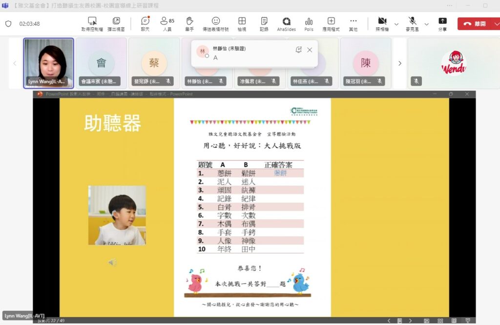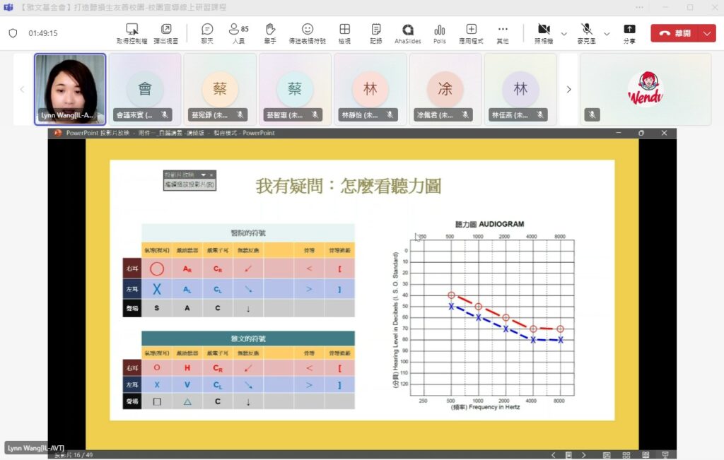 融合教育為目前教育主流,本會服務之聽損生約有九成安置在普通班就讀,但是聽損生的學習需求仍並不為普通班老師所熟悉。雅文基金會宜蘭中心為此舉辦「打造聽損生友善校園-校園宣導線上研習」課程,協助教師增進對聽障生的認識,提升融合教育知能,調整校園環境之友善程度。當天共計15縣市90名教師上線參加。