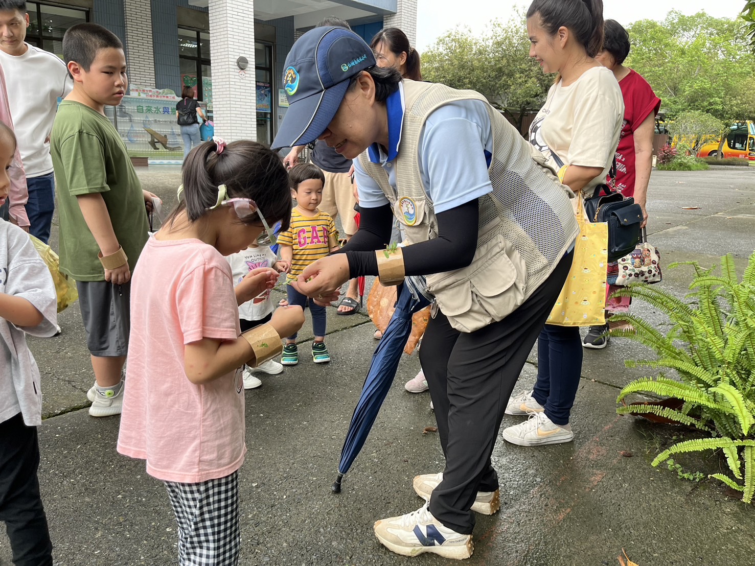 深溝水源生態園區座落於員山鄉,家長及孩子們跟隨著志工老師的腳步,觀察園區內的各類動植物,包括:蕨類、麵包樹、躲在葉片內的小蝸牛等等。于珊老師也邀請孩子們沿途採集地上的落葉、花瓣,黏在自製的手環上,親子一起完成美麗的自然裝飾品。志工老師也介紹許多淨水廠歷史及水資源知識,引導孩子們了解珍惜水資源的重要觀念。
