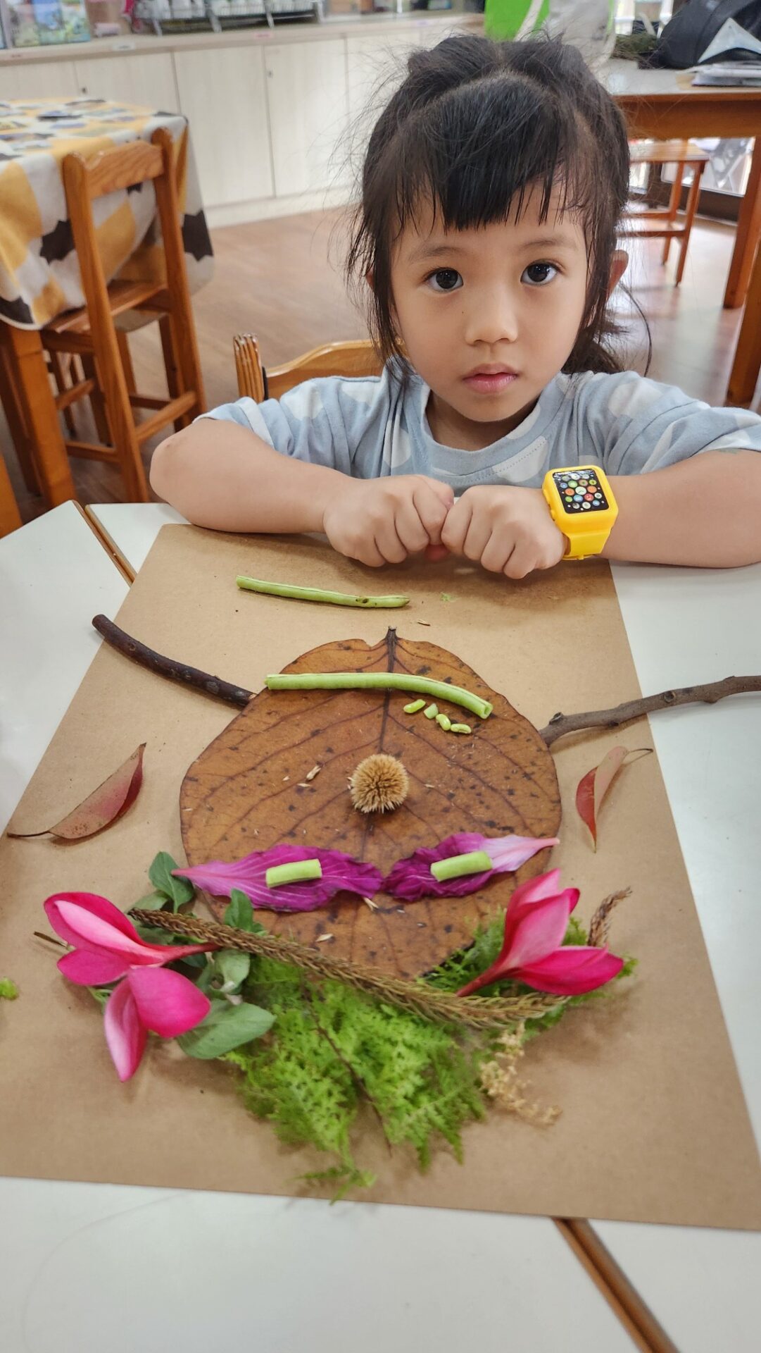 最後,于珊老師請孩子們利用各式種子、樹葉、花瓣等自然媒材創作臉譜。孩子們的創造力紛紛爆發--其中有孩子將四季豆豆莢撥開,撥出一粒一粒的小豆子,排在嘴巴上方,告訴大家「這是牙齒喔!」。也有孩子仔細擺出眼鏡的鏡架等細節,展現細膩的觀察力。