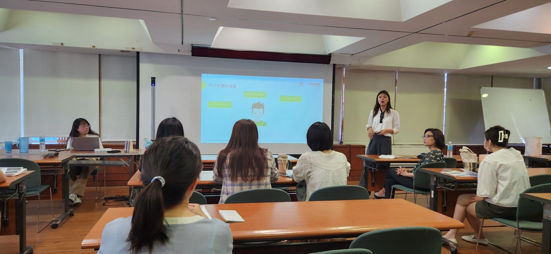 林翊涵聽力師在講座中提醒家長:聆聽訊息時,孩童需要更高的訊噪比,這是因為兒童的聽覺網絡及聆聽技巧仍在發展中。校園內充斥各種噪音,對於兒童的學習有不利的影響;家庭活動(如:家族聚餐、參加導覽行程)也有同樣的挑戰。使用遠端麥克風系統是一種簡單且快速幫助孩子降低聆聽費力度的方案。除了理論說明之外,聽力師也當場模擬噪音情境,讓家長們感受使用遠端麥克風系統前後的差異。家長試用後紛紛表示「沒想到聆聽感受差異這麼大」,「我的孩子還沒有使用遠端麥克風統,現在我知道這個輔具對孩子很重要,我回去後會積極申請。」