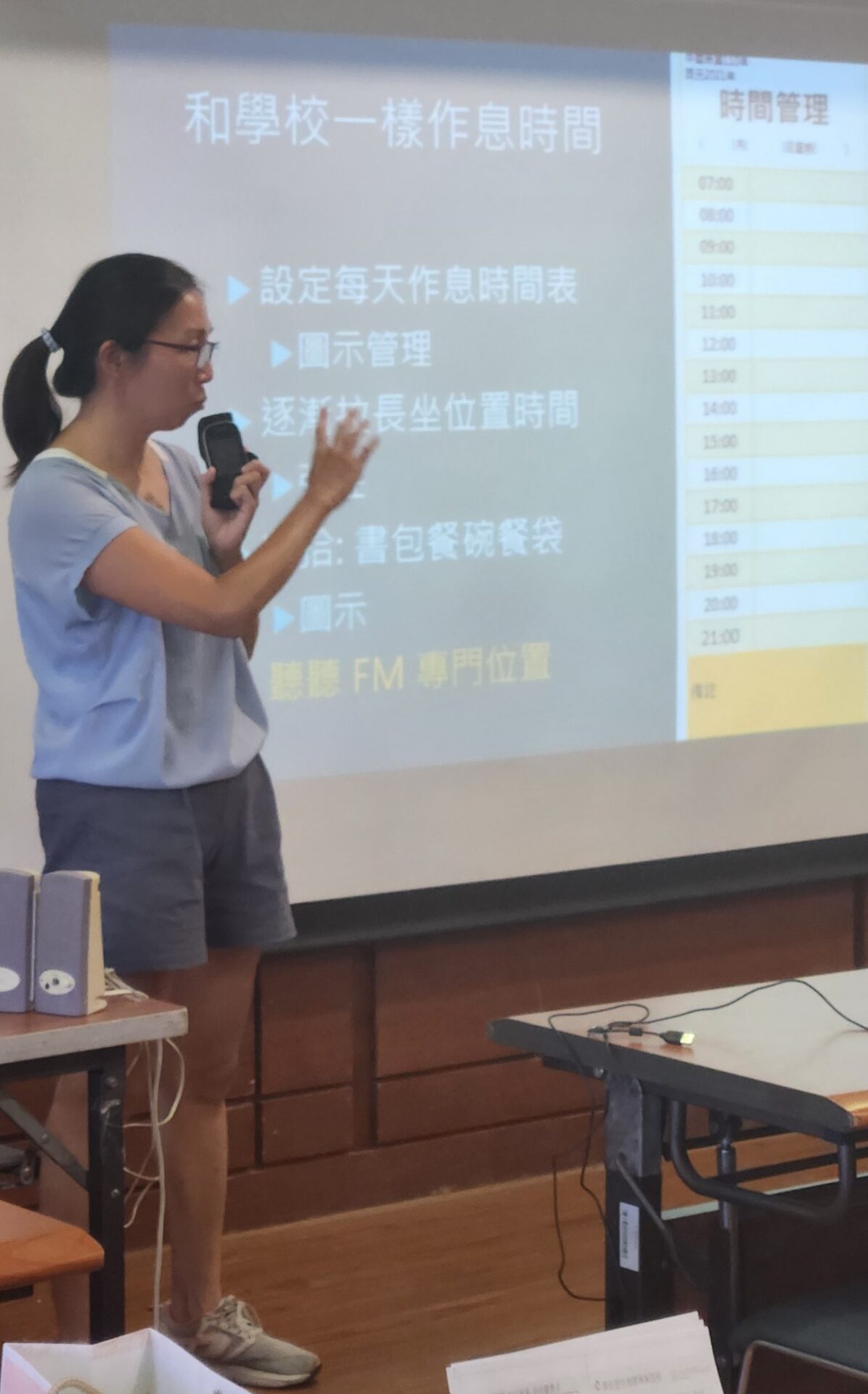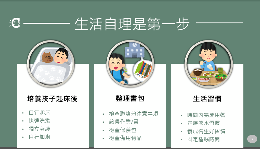 第二部分,由資深家長宗澄媽媽分享過去的育兒經驗。她整理了各個治療師的建議與自己閱讀育兒書籍的心得,細緻分享在家陪伴孩子提升聽能、認知、書寫等能力的方法。此外,宗澄媽媽也強調作息規劃的重要。建議家長設定每天作息時間表,幫助孩子適應學校作息。