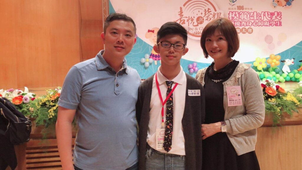 軒億品學兼優,圖為106學年度獲選新北市優秀身心障礙學生,全家人合影。