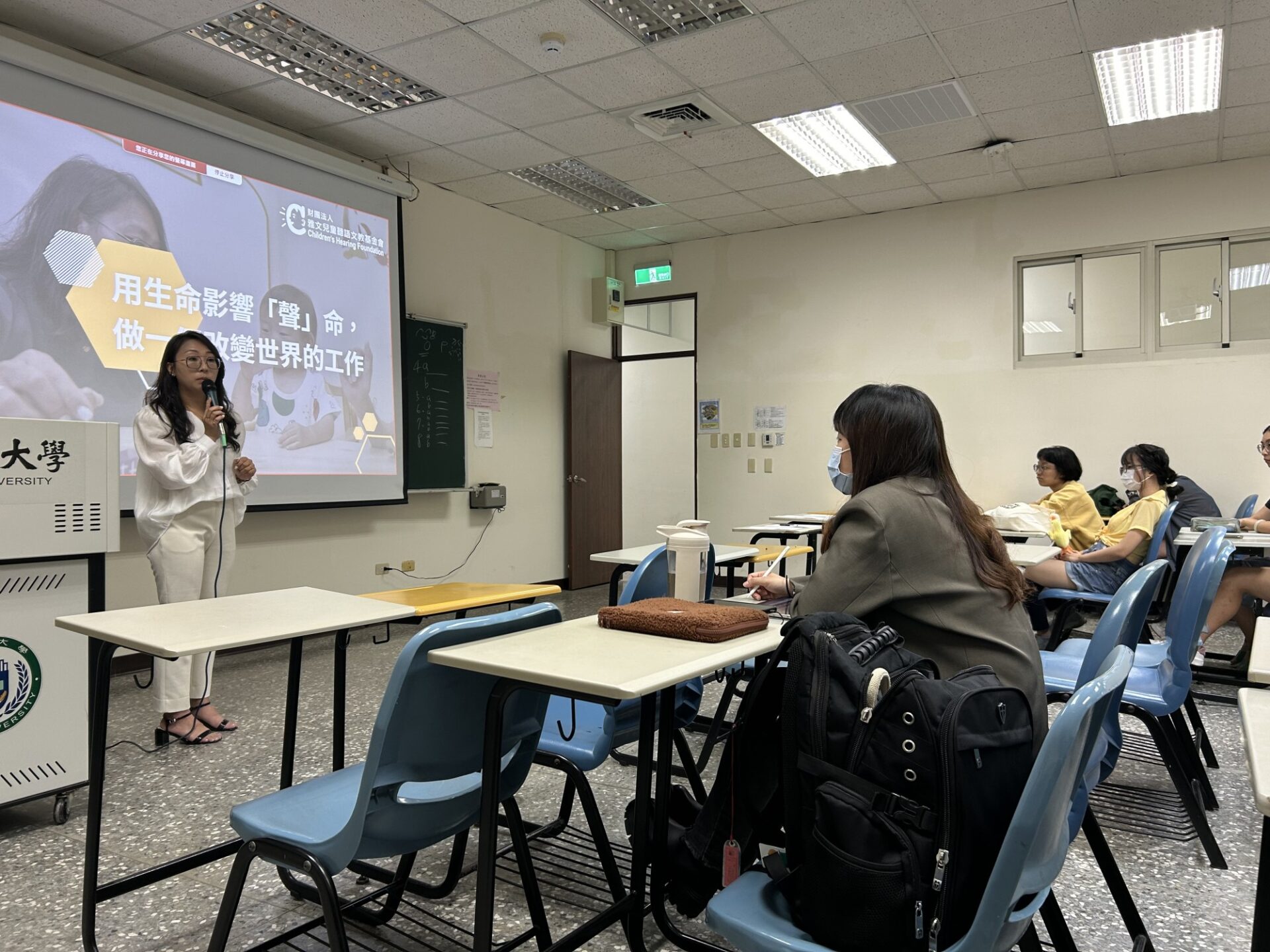 在亞洲大學行政大樓的教室裡,坐著三十幾個聽語系的學生,他們不只擁有聽語專業領域的知識,也是未來在幫助聽損兒童的道路上,能與雅文比肩的潛在合作夥伴,透過校園講座我們不只分享聽語早療的實務現場,也讓學生們拓展視野,看見公益攜手專業為聽損兒創造的美好未來。
