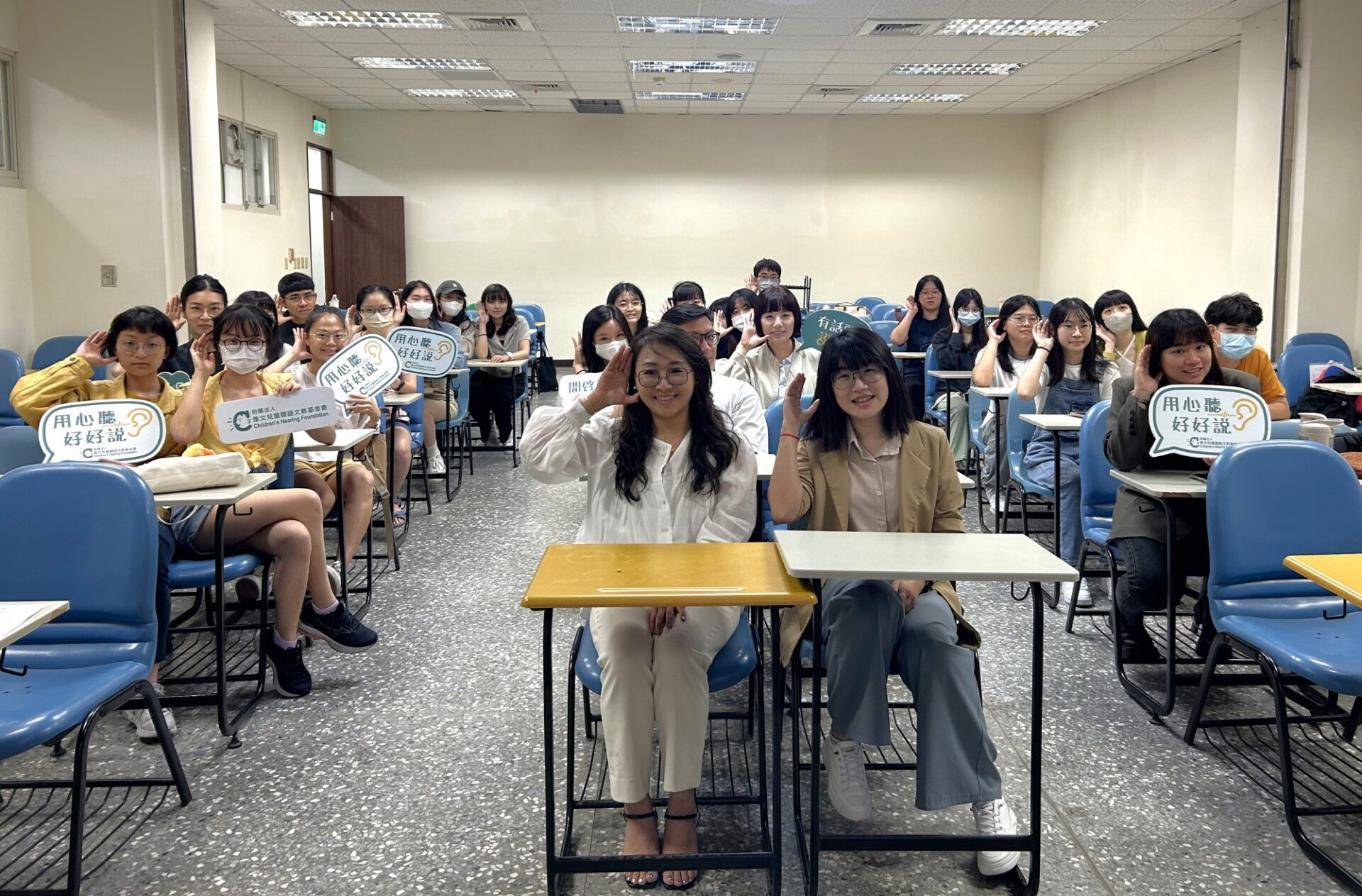 講座結束後,學生們紛紛來到台前詢問如何成為聽覺口語師、聽覺口語法的各種實務技巧、聽覺口語師招募的訊息……,我們彷彿已經預見,更多人加入我們,以專業實踐公益、一起幫助聽損兒學習聽與說的美好未來。