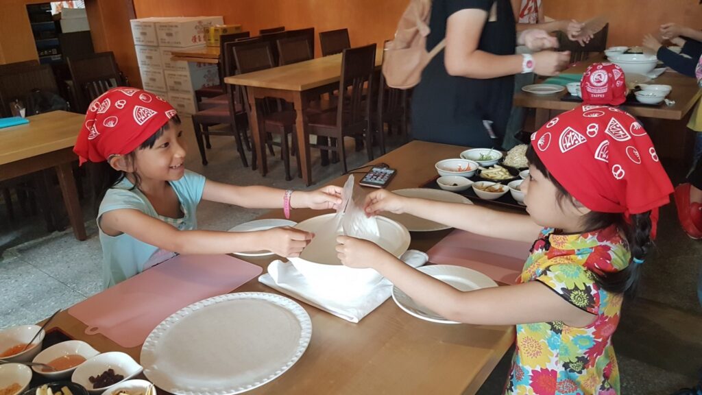 結束了肥皂體驗後,導覽老師帶我們進行泰式春捲DIY活動,還為孩子們綁上可愛的頭巾,孩子們立刻化身成小小師傅,和家長們一同完成春捲,並迫不及待地與老師及其他家庭分享。