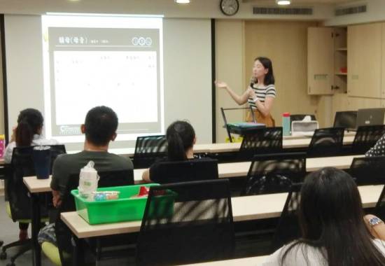 接著來到實際操作,由於此堂課都是年紀較小的孩子,所以由最基礎的韻母開始練習,每個家長針對目前自己孩子需要練習發出的韻母設計相關活動,再給教具操作,模擬在生活情境下什麼時機可以練習什麼樣的發音,家長們紛紛想出有趣的活動引導孩子,例如:吃餅乾的時候,爸爸說「ㄚ」,吃一口餅乾,換媽媽說「ㄚ」也吃一口,最後換孩子嘗試發出「ㄚ」的聲音。
