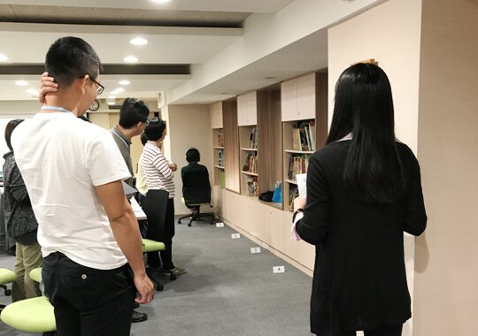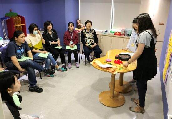 第三關為「誰最會玩」,由謝佩吟聽覺口語師及胡文俐聽覺口語師帶領。此學習站著重在提高語音檢測的趣味性,透過適當的玩具選擇和居家活動的設計,讓檢測活動像是遊戲而非考試,以提高孩子配合度。經驗豐富的關主分享了許多小技巧,除讓學員了解如何依據孩子的個別差異挑選玩具外,也特別強調「生活化」,提醒大家就算沒有玩具,只要利用家裡現成的物品就能進行「五星級(有省錢)」的居家檢測活動。關主分享完後,也請大家分組討論不同玩法,並用情境題讓學員進行練習。透過此關卡,學員們除了自己挑選玩具或物品來設計語音檢測遊戲,也在互相交流中彼此激發了更多創新點子。