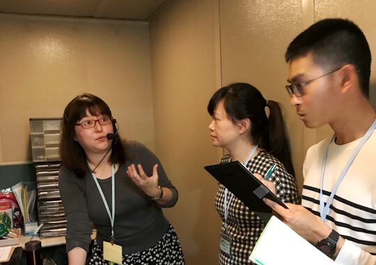 第二關為「誰最會說」,由馬英娟聽力師及楊琮慧聽力師擔任關主,這個關卡的目的是提高檢測者的發音穩定度,以促進語音檢測準確度。首先由關主示範如何進行語音校正,以及如何監控自己的發音。接著每位學員都有機會親身練習,並獲得一對一指導。練習過程中,大家都表示穩定發音看似簡單,沒想到竟然這麼具有挑戰性。針對學員的困難,關主除了引導學員利用聲壓計或聽檢儀的視覺提示觀測自己的聲音,還熱心提供了一些發音的小秘訣。經過多次練習,學員們不僅更加認識自己發音的特質跟習慣,也漸漸掌握穩定發音的訣竅。