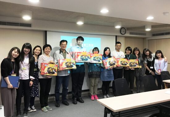 闖關遊戲獲勝的組別獲得實用的玩具組,開心地與關主們合照。