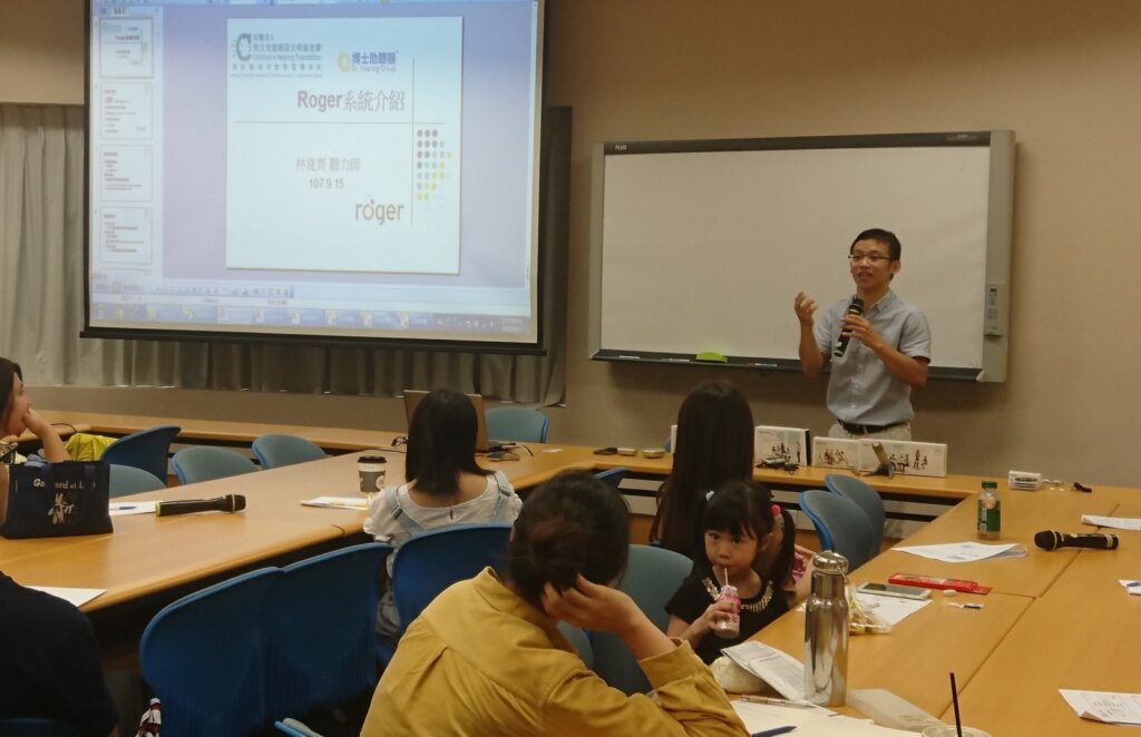 課程開始,聽力師先介紹聽覺輔具可搭配的無線系統,同時說明各廠牌助聽器可搭配使用的FM系統,及有可能面臨的問題,而這次也針對政府採購的『Roger系統』做詳細解說,並介紹其他相關遠端系統輔具,讓孩子可以在未來團體生活有更多選擇,避免孩子因聽不好而影響學習狀況。
