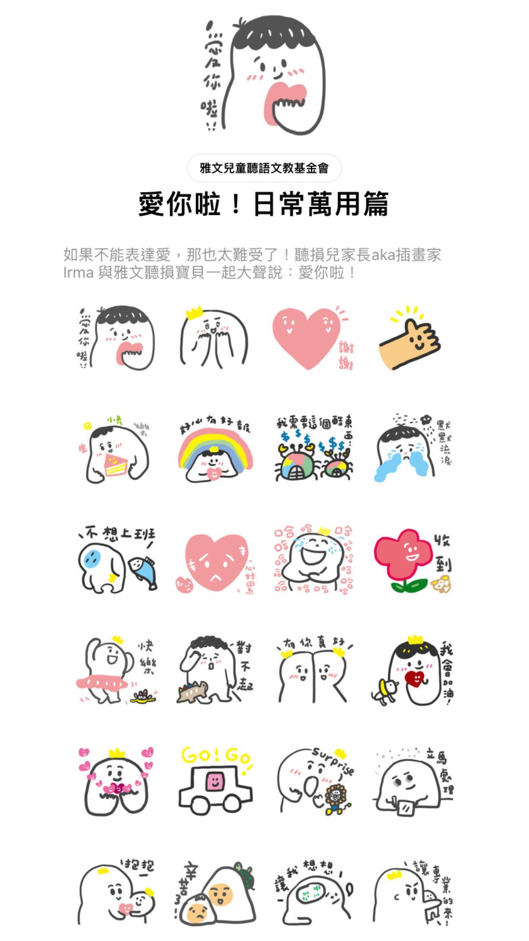 今年雅文基金會邀請陳恩媽媽,也是專職插畫家的馬良慧 Irma,一起合作出版 Line 貼圖,鼓勵所有的聽損兒家庭不要放棄,即使陳恩因為罕見的先天條件限制無法順利發展口語,但是他從不放棄表達,例如睡覺前會對爸爸媽媽比一個愛的大全套:手比大愛心、臉頰小愛心、頭頂愛心,這樣爸爸媽媽就能知道陳恩超愛他們。「一個人若不能表達心中的愛意給另外一個人知道,那是很不舒服的事情,所以我也會將愛的元素放進貼圖裡,希望做出一組好賣、可愛、符合雅文基金會形象,又可以支持聽損兒的貼圖!」媽媽開心地說。
