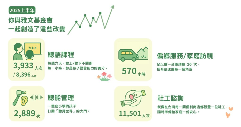 我是宛倫 Kelly,一位重新回到雅文基金會工作的聽損大朋友。很開心由我來向您分享 2025 上半年,我們一起完成的故事與成果。