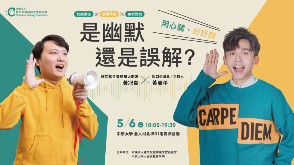 5月6日,雅文基金會與中原大學人文與教育學院攜手舉辦《是幽默還是誤解?——用心聽,好好說》講座,邀請知名主持人黃豪平與聽損大朋友黃冠貴,從不同的生命經驗出發,深入探討幽默、表達與誤解之間的微妙界線。