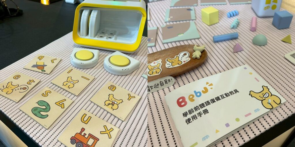 當他轉入工業設計系後,那顆種子發了芽 ,成為畢業專題《Bebu!》的起點,和同學洪翊敏一起製作一套為聽損兒設計的互動教具——《Bebu!》,這件作品也曾獲得校內期末競賽產品開發組的《金獎》,對兩位設計師而言是一個重要的里程碑,也因此更有信心持續打磨內容,最終登上新一代設計展讓更多人看見!