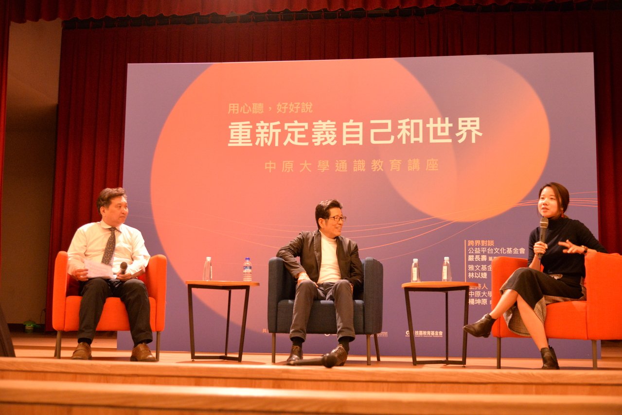 重度聽損高材生林以婕(右)、嚴長壽董事長(中)對談,左為擔任主持人的中原大學人文與教育學院院長楊坤原。