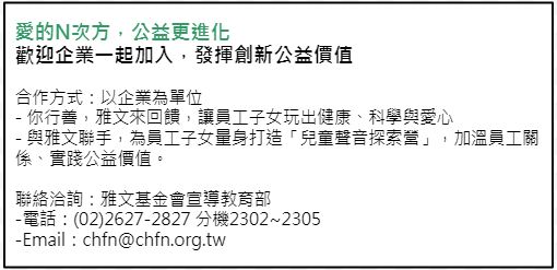 透過小組討論展現團隊合作與創意,孩子用精心製作的海報展現這一整天下來學習到的聽力保健知識。「兒童聲音探索營」在家長熱烈的掌聲中畫下完美句點,也期待更多愛心企業加入雅文基金會的行列,一起發揮創新公益價值!