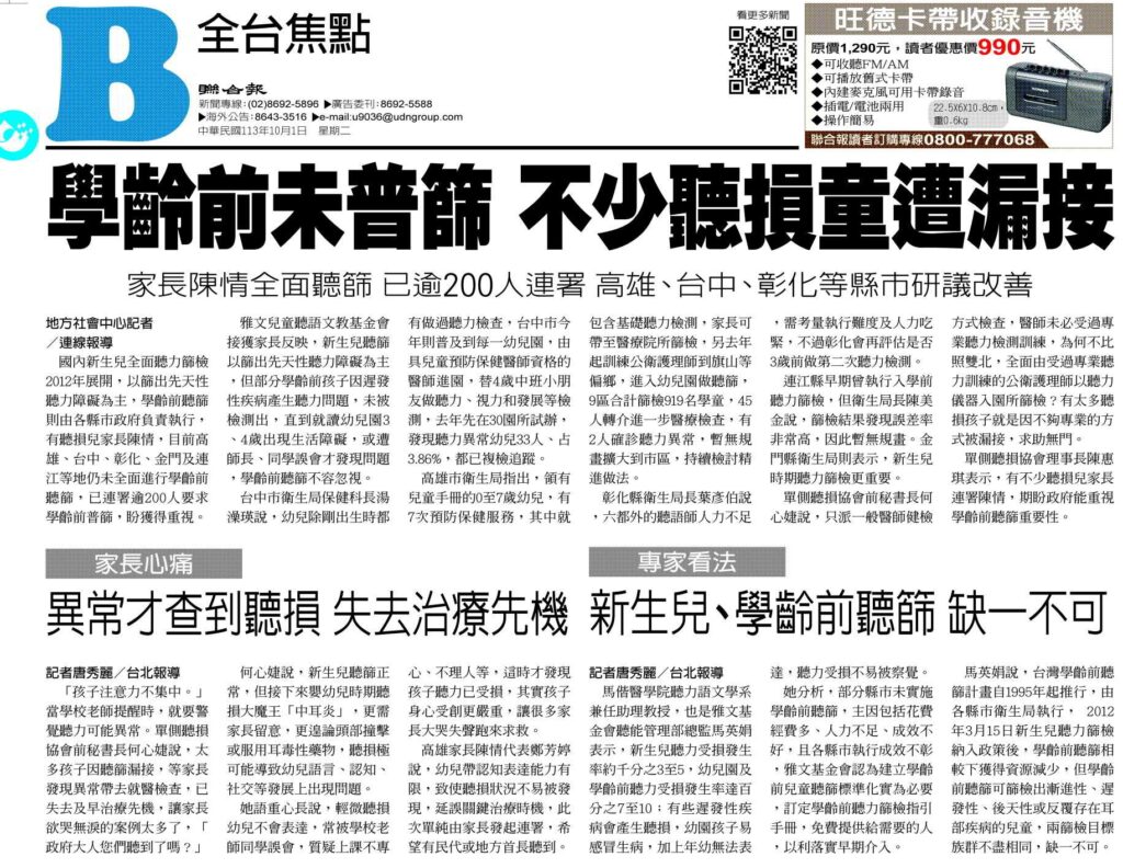 來源:專家看法:新生兒、學齡前聽篩 缺一不可 | 生活新聞 | 生活 | 聯合新聞網 (udn.com)