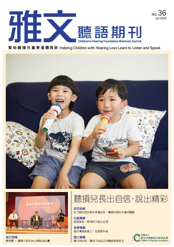 期刊 【NO.36】聽損兒長出自信,說出精彩 PoyaHsu 2020/01/15 1.1 點擊看期刊前半部 研究前線從了解自我到敢於表達自我︰聽損兒通往社會的關鍵文/聽語科學研究中心 研究員/陳姵樺 社服專欄按部就班,帶領孩子建立自信文/社會服務部 社工/林雯瑄 教學專欄提升溝通表達力,自信更升級文/教學研發部 聽覺口語師/鍾雅婷 聽力專欄聽力問診室:讓孩子為自己的聽能管理做主文/聽能管理部 聽力師/馬英娟 點擊看期刊後半部 家庭故事家裡再苦,也不能放棄讓孩子開口說話的希望 人物寫真接受自己的不一樣,用溫柔的心感受世界 雅文現場集聽語專業大成,雅文為聽損兒家庭打造教學指南譜出聲命的樂章 第18屆《倪安寧獎》頒獎典禮特別報導嚴長壽x聽損大朋友林以婕對談紀實 PoyaHsu 【年度回顧】回顧2019,感謝所有支持雅文的您 多等於好?別讓你和孩子累倒在起跑點上 【NO.47】探... 【NO.46】聽... 【NO.45】一... 【NO.44】遺... 【NO.43】我... 【NO.42】傾...