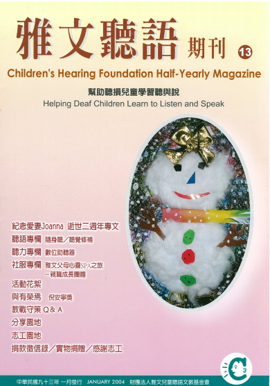 期刊 雅文聽語期刊-NO.13 aslanchen 2004/01/25 859 點此閱讀期刊:1、2 目錄: 紀念愛妻Joanna逝世二周年專文 聽語專欄: 隨身聽/聽覺修補 聽力專欄: 數位助聽器 社服專欄: 雅文父母心靈SPA之旅-親職成長團體 活動花絮 與有榮焉: 倪安寧獎 教戰守策Q&A 分享園地 志工園地 捐款徵信錄/實物捐贈/感謝志工 期刊連結:前、後 aslanchen 雅文聽語期刊-NO.12 如何在房間裡為孩子創造語言輸入的機會? 【NO.47】探... 【NO.46】聽... 【NO.45】一... 【NO.44】遺... 【NO.43】我... 【NO.42】傾...