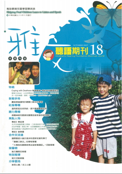 期刊 雅文聽語期刊-NO.18 aslanchen 2007/10/25 869 點此閱讀期刊:1、2、3 目錄: 特稿: 戰勝聽損~寫給其他聽損朋友 教戰手冊: 鷹架理論運用於聽覺口語法的學習 社服專欄: 運用家庭支持系統,提升聽損療育成效 聽力專欄: 感覺神經性聽損兒童應該接受基因檢測嗎? 焦點人物: 專訪>陳廷瑋 專訪>謝奉圜 合作交流道: 國際廳與大會於澳洲布里斯班順利舉行 「聽覺口語法」的學程擘畫 「大專院校聽障教育巡迴宣導講座」~活動報導 榮譽榜: 雅文團隊的榮耀 特別報導: 雅文活動錦集 分享園地: 家長心聲 志工心聲 aslanchen 人工耳蝸候選人決定條件及植入體的選擇 家長在日常生活可運用之聽覺口語教學策略 【NO.47】探... 【NO.46】聽... 【NO.45】一... 【NO.44】遺... 【NO.43】我... 【NO.42】傾...