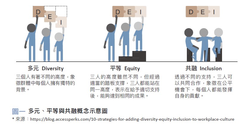 多元、平等、共融(Diversity, Equity, and Inclusion,簡稱DEI)的概念起源可以追溯至60 年代美國種族歧視造成的就業問題,隨著時間推進,這個概念在企業及專業人員中擴展開來,融入企業的文化當中,推動在工作場域應該要包容多元背景的員工,並提供公平的機會,讓在工作場域中的專業人員皆可以貢獻自己。近年來,這個概念更拓展到幼兒教育及特殊教育上,在國際上更是被廣泛的討論(OECD,2023; NAEYC, 2019),特別是在於提供符合幼兒需求的教育服務上多有著墨。那麼,到底甚麼是多元平等共融?
