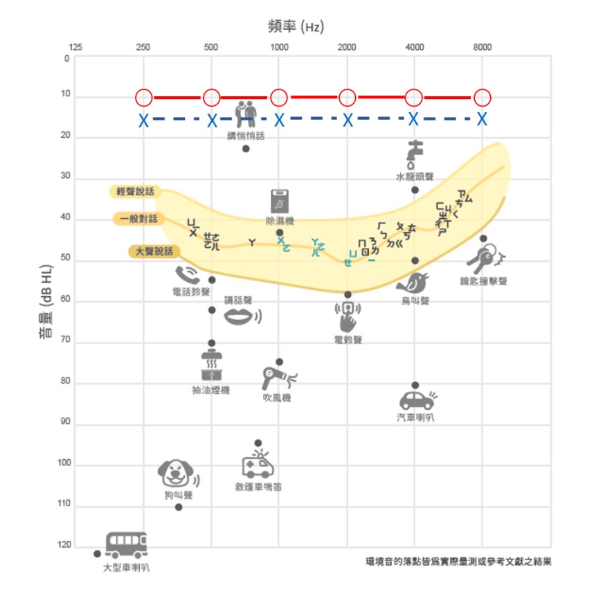 上圖為「聽力圖」,其橫軸為頻率(從左到右為聲音的低音到高音),縱軸為音量(從上到下為聲音的小聲到大聲);透過圖內的圈圈”o”、叉叉”x”標記,可記錄受測者的右/左耳,分別對於低/高不同頻率的聲音,有著何種的察覺靈敏度。此圖中可見,右耳聽力(符號標記o)不論高低音均落在10分貝,左耳聽力(符號標記x)不論高低音均落在15分貝。