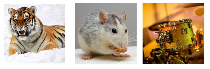 上圖為語音聽辨測驗示意圖,測試題庫可能會有數頁,每一頁會有數個相似語音,陪同孩子練習後聽力師會播放語音施測,並藉由孩子能否「聽到聲音後正確指認」,來評估孩子對於語音的聆聽正確性(針對不同發展年齡會有不同的測驗材料);以上圖舉例,在確認孩子認得上面三個圖片後,若聽力師以輕聲語音說出「虎」,但孩子指認為「鼠」,便可得知孩子在輕聲環境下極可能會有「虎」「鼠」聆聽混淆的情形。