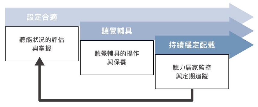 圖一 聽能管理所包含的三大面向,其實是圍繞在「持續穩定配戴設定合適的聽覺輔具」的核心概念上