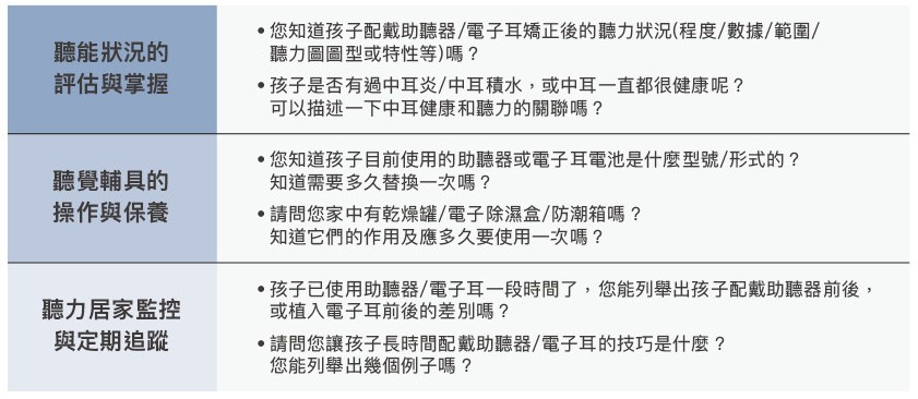 因此,聽能管理的三大面向即為:(一)聽能狀況的評估與掌握、(二)聽覺輔具的操作與保養、(三)聽力居家監控與定期追蹤。