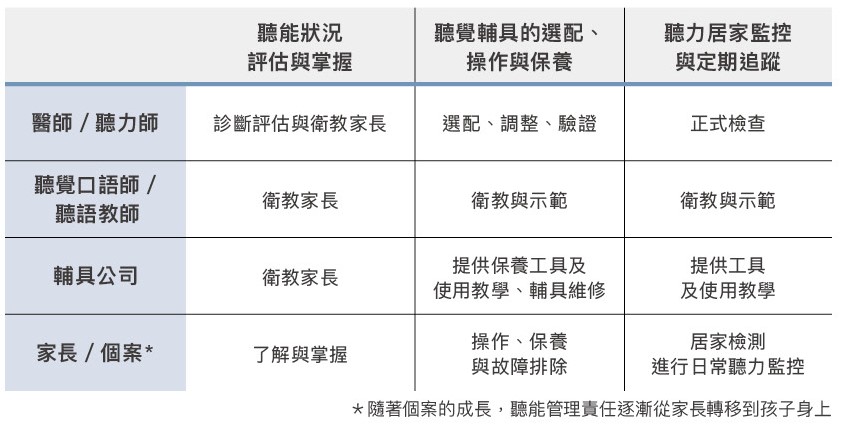 如表一所列,耳科醫師和聽力師需合作進行診斷、評估、輔具調整及衛教等工作;聽覺口語師或相關專業人員需就聽能管理的各個面向給予個案及家長示範及衛教;而輔具公司則在衛教之外,亦需提供相關的工具以及維修保養等服務。而在孩子年幼時,家長是落實聽能管理的主要角色,但隨著孩子逐漸長大,聽能管理的責任也需慢慢轉移到孩子的身上,讓孩子懂得為自己的聽能負起責任。但這並不是在孩子成年的那一天突然就把所有責任轉移到他身上,而是如同所有培養孩子獨立能力的過程,需要家長的陪伴與引導。這部份詳細的觀念與作法,可參考本期的社服專欄。