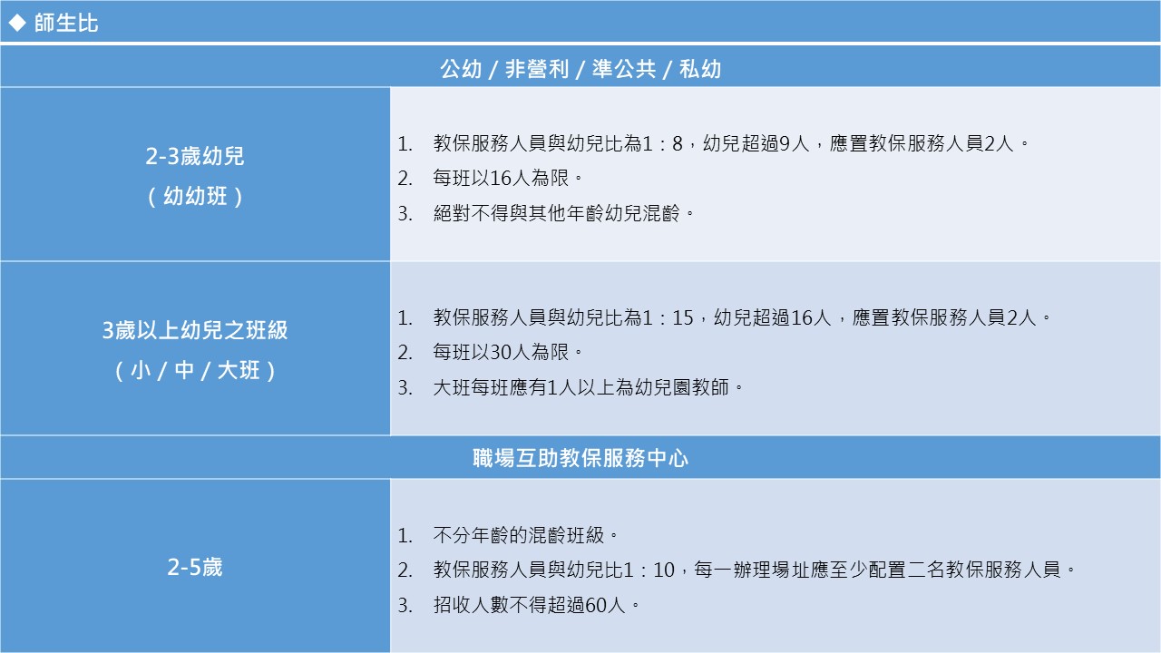 教育部規劃自2023年8月起,循序漸進調降幼兒園師生比,提升幼兒受教品質,師生比調降至「1:12」。公幼及非營利幼兒園自2023年8月起、準公共幼兒園自2024年8月起逐步實施;一般私立幼兒園則自2024年8月起尊重其參與意願調降。職場互助教保服務中心自2023年8月起則是逐步調降至「1:8」。
