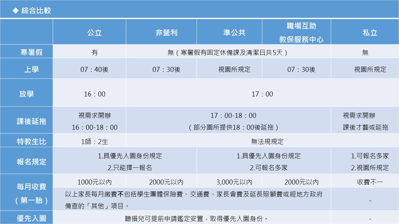 2. 收費:公共化及準公共幼兒園皆有每月收費上限,公幼乍看每月收費最少,但家長仍需考量寒暑假送托所延伸的額外費用,部分縣市已有提供公幼延拖獎勵辦法或規定,鼓勵學校開辦托育服務,建議家長可提前了解屬意的公立幼兒園是否有寒暑假托育的相關規劃。