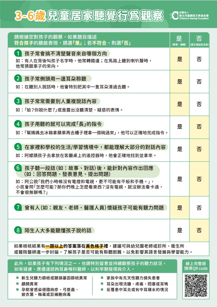 學齡前聽力篩檢 3-6歲兒童居家聽覺行為觀察 Chang Allen 2025/08/05 1.3 2025.08.05 3-6歲兒童居家聽覺行為觀察下載 Chang Allen 大腦學習的關鍵:從聽覺輸入到語言理解 【南區中心】教師專業知能進修研習課程報名-認識聽力損失及聽損生融合校園之需求 學齡前兒童聽力篩... 給家長和老師的學... 學齡前聽力篩檢沒... 認識兩階段聽力篩... 幼兒園聽力篩檢沒... 老師說我的孩子需...