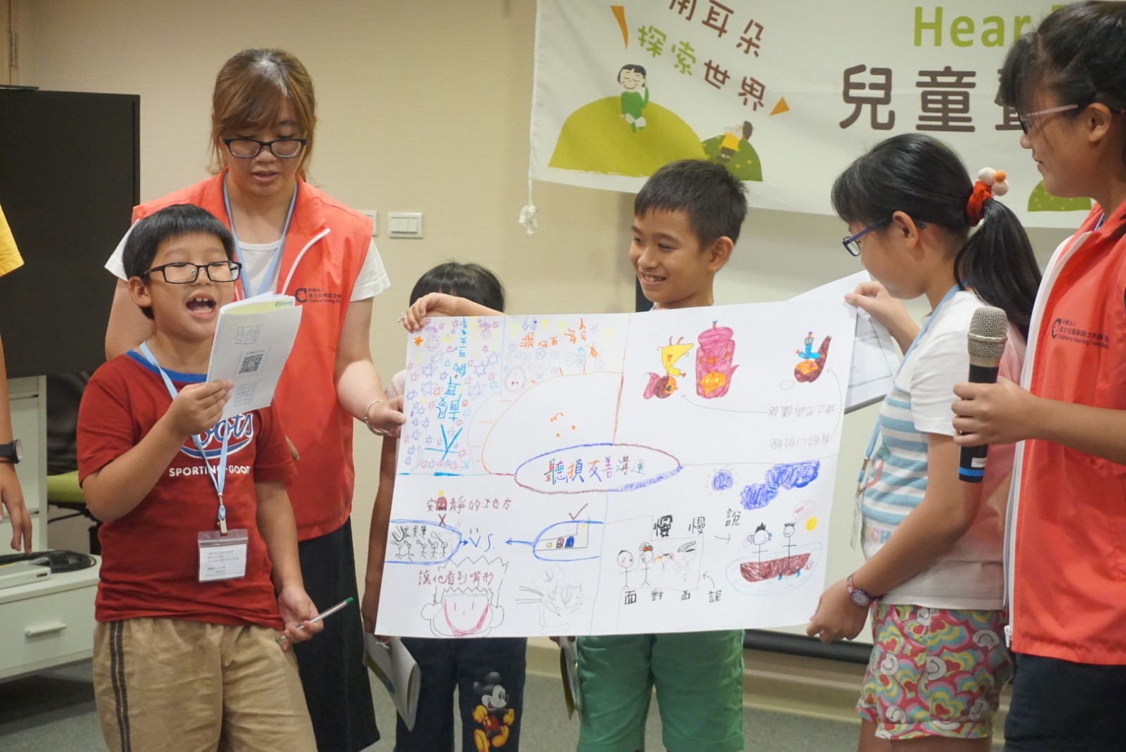 Last, but not the least, came the presentation time! Through group discussions, the children went on stage to demonstrate their teamwork and creativity through a situation drama. They confidently shared their learning during this camp; the children not only made beautiful posters but also performed how they would protect their ears as well as communicate with people with hearing loss. The camp had a perfect ending with a successful result that participating children have become little pioneers of hearing health.